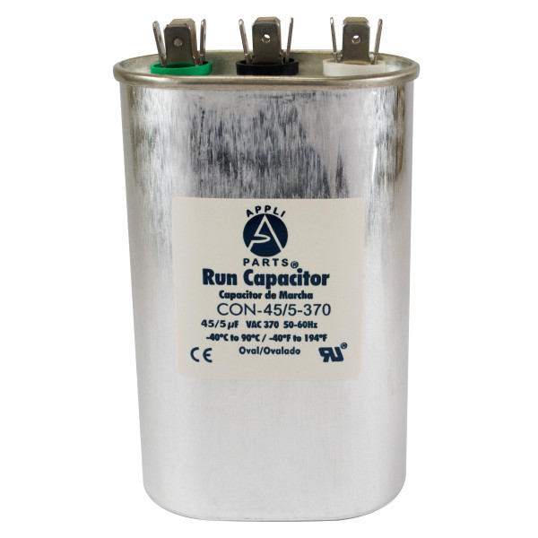 Appli Parts Dual Run Capacitor for ac 45+5 Mfd uF (microfarads) 370VAC CBB65 Oval Universal fit for hvac and other applications 2-3/4in Wide 1-3/4in Depth 4-3/4in High CON-45/5-370