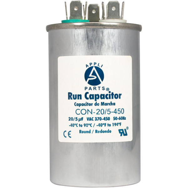 Appli Parts Dual Run Capacitor for ac 20+5 Mfd uF (microfarads) 370VAC or 450VAC CBB65 Round Universal fit for hvac and other applications 3-7/8 in High 2 in Wide CON-20/5-450