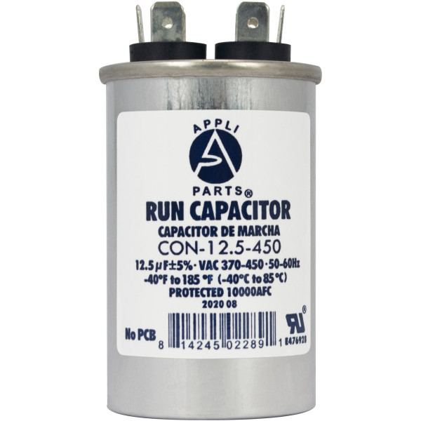 Appli Parts Run Capacitor for ac 12.5 Mfd uF (microfarads) 370 VAC or 450 VAC CBB65 Round Universal fit for hvac and other applications 3 in High 1-1/2 in Wide CON-12.5-450