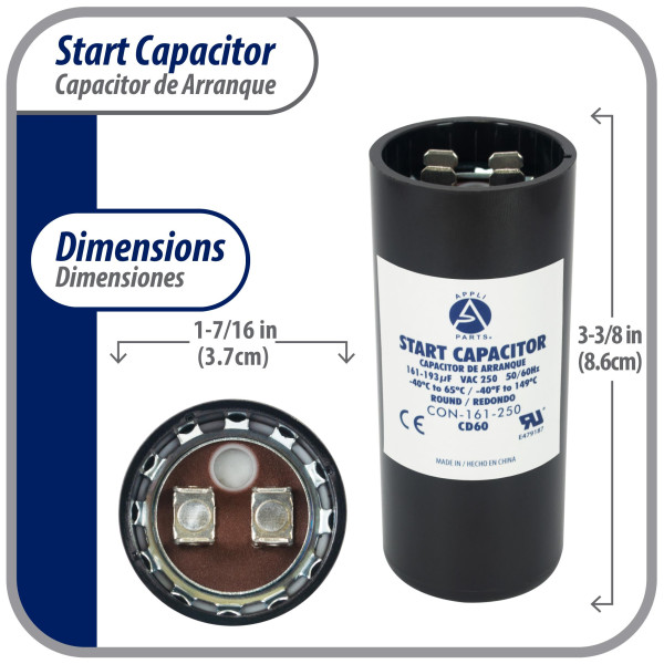 Appli Parts motor start capacitor 161-193 Mfd (microfarads) uF 250 VAC universal fit for electric motor applications 1-7/16 in Wide 3-3/8 in Height CON-161-250